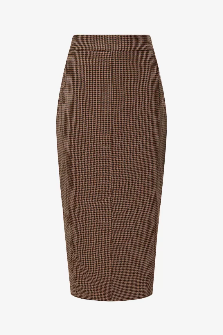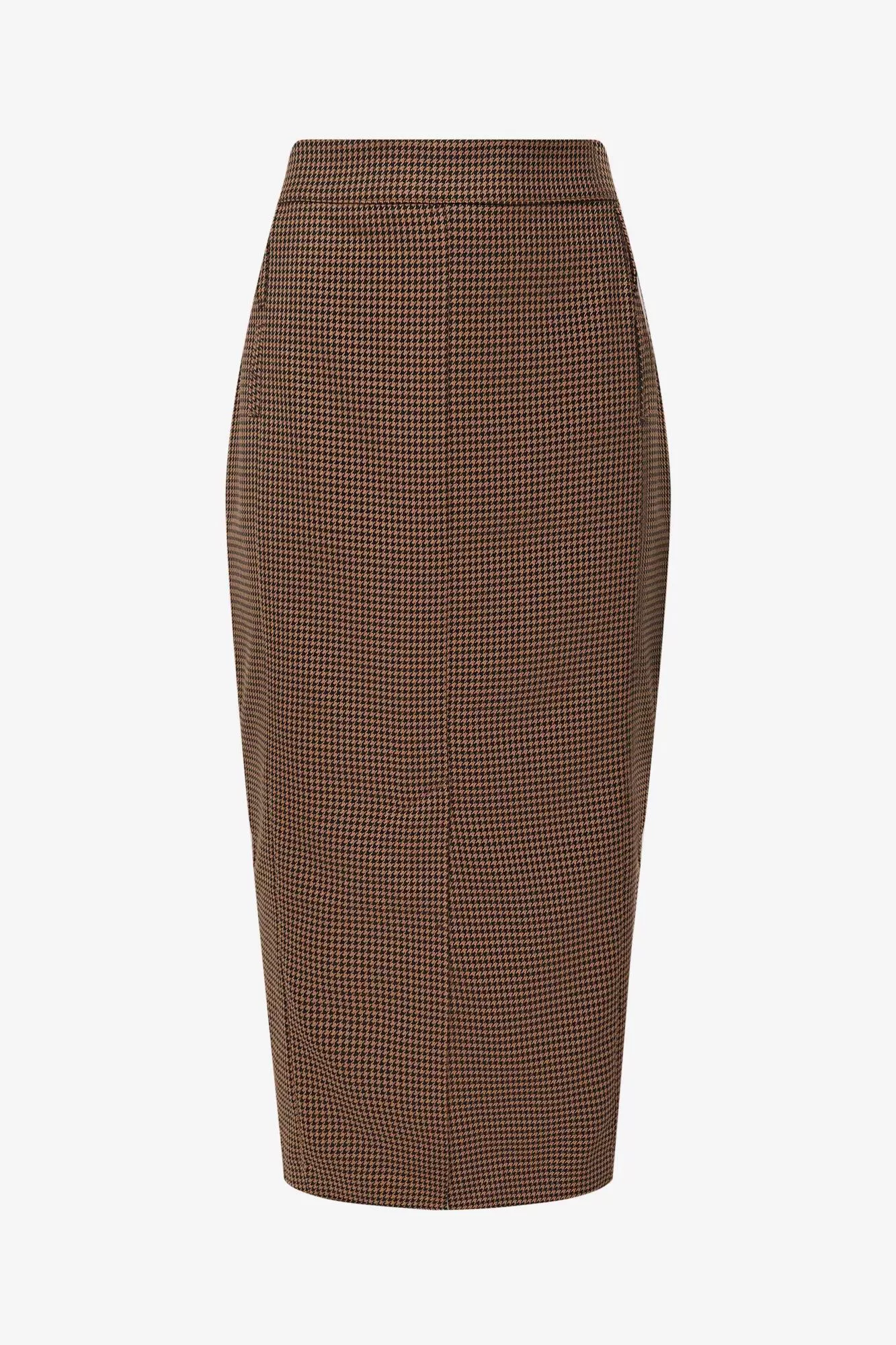 Идеальная осенняя юбка по всем параметрам: удобная посадка, модный разрез, актуальный цвет, стильный принт, который никогда не выходит из моды. Сочетайте юбку с жакетом точно такого же цвета и принта - он есть в новой коллекции. Под него наденьте топ в оттенке капучино. Также отлично подойдёт майка или рубашка белого или черного цветов.