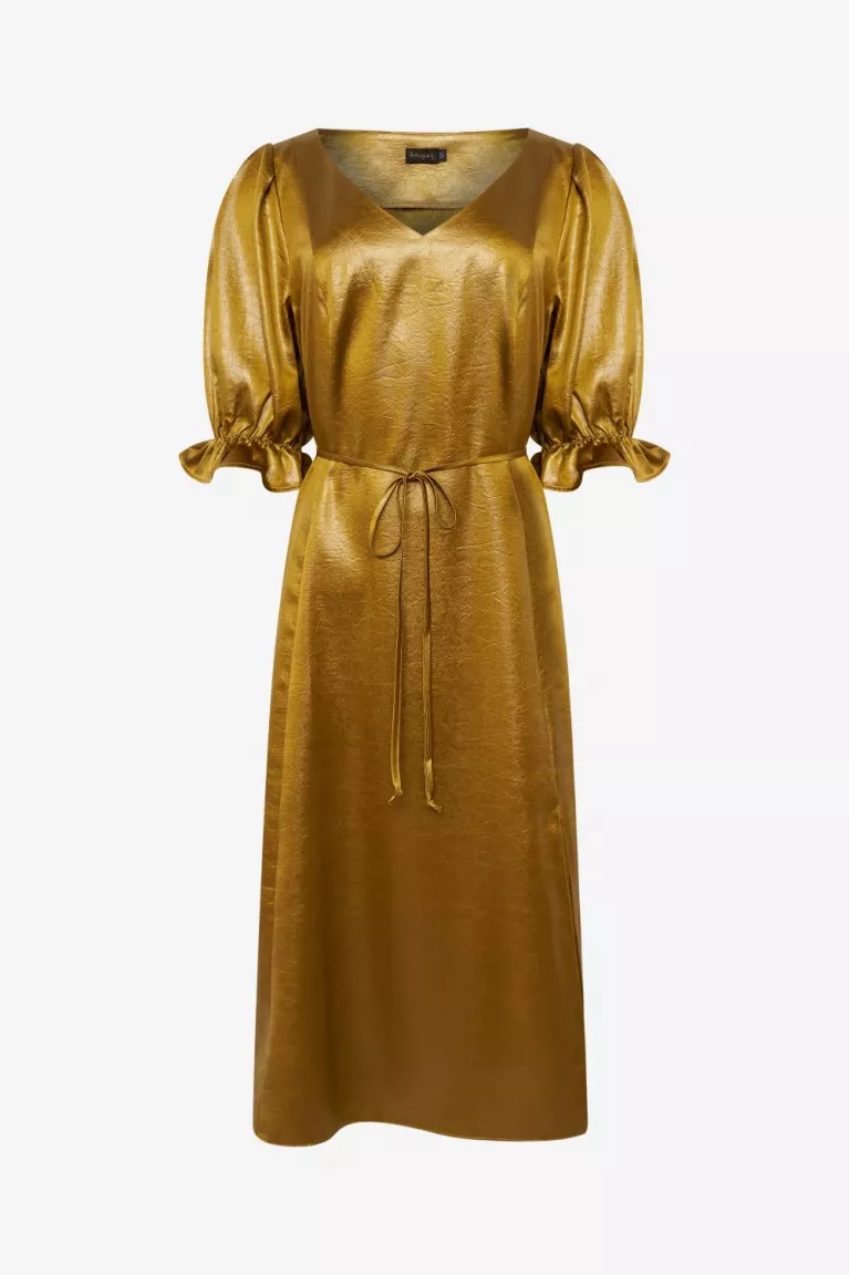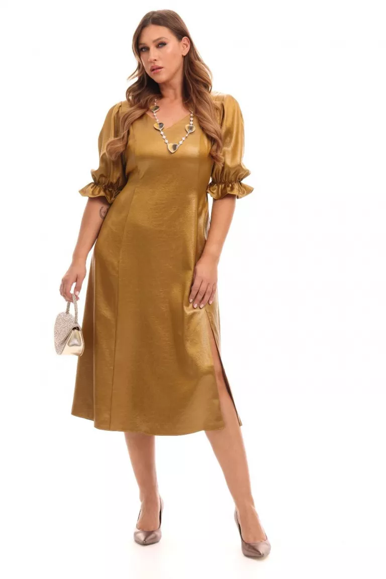 Платье из ткани с эффектом лаке, длина миди. Вырез V-образный. Рукава фонарик, пройма широкая. Спереди боковой разрез и рельефы. На спинке вырез каре. На талии вшитый пояс.