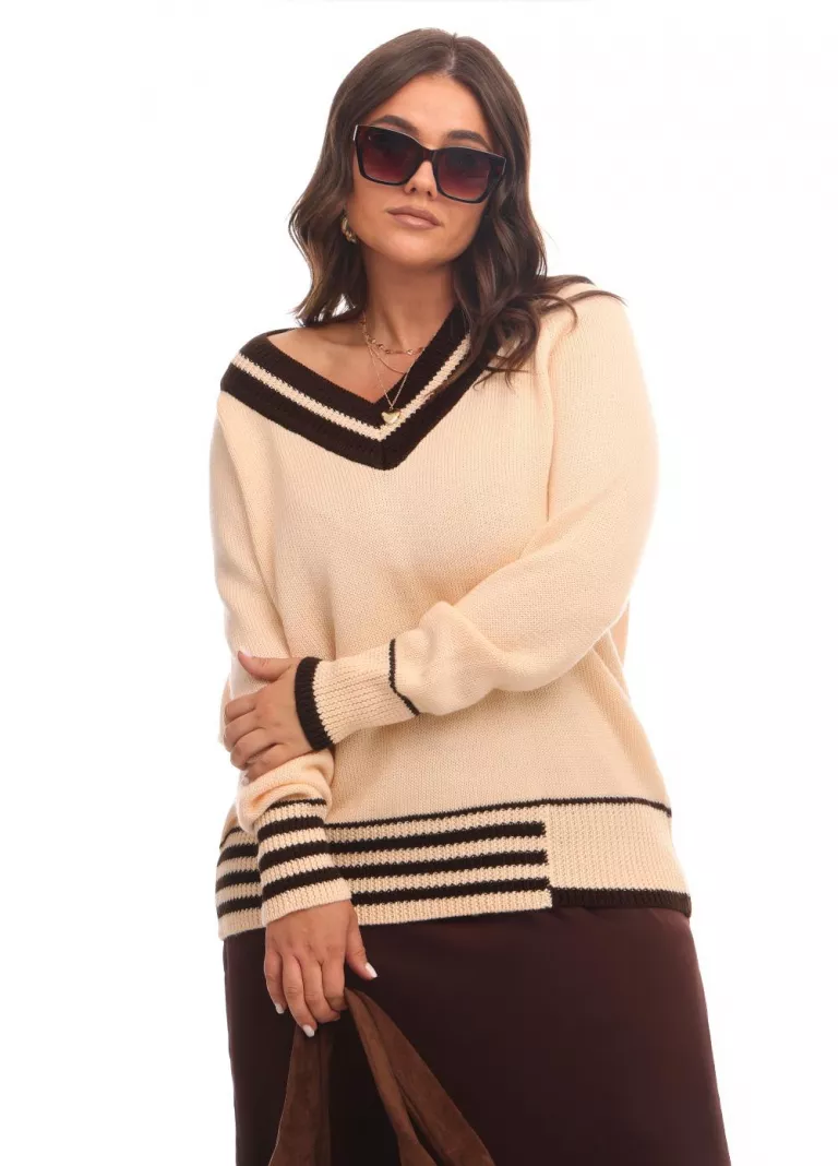 Джемпер в стиле преппи, вдохновлённый университетской эстетикой, выполнен из вязаной шерсти с добавлением кашемира. Его акцентные контрастные полоски на длинных рукавах реглан, по низу изделия и вдоль v-образного выреза подчёркивают изысканность модели. Этот джемпер станет отличным выбором для создания элегантного, но повседневного образа.