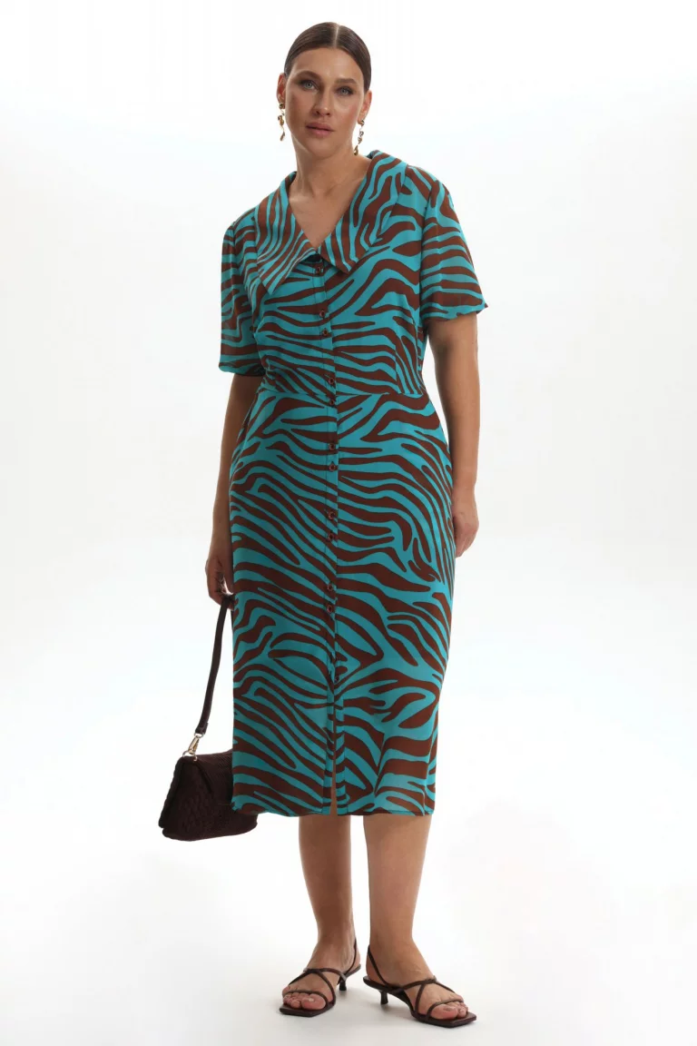 Расклешенной платье на пуговицах, из шифоновой поливискозы, на подкладке, длиной миди. Горловина округлая, воротник отложной, отрезное по талии, застежка пуговицы. Рукав 3/4, фонарик, пройма широкая.