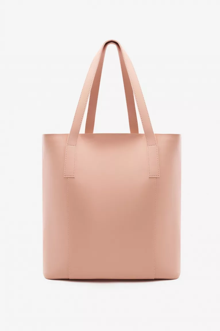 Сумка тоут из экокожи, без застежки и подкладки. Одно несъемное внутреннее отделение на молнии, один боковой карман.