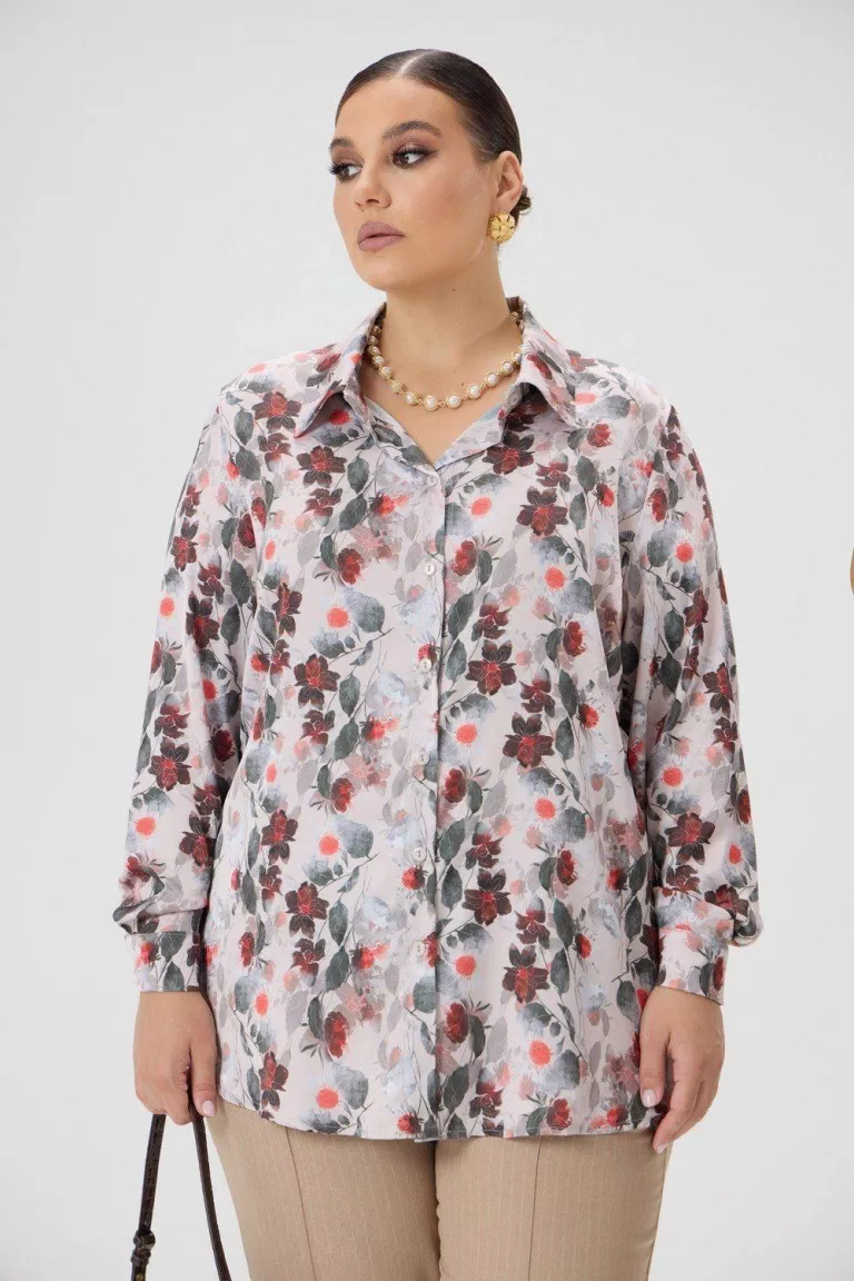 Рубашка свободного силуэта, из вискозы шелковистой фактуры, длина миди, разноуровневая. Воротник стояче-отложной. Спереди застежка пуговицы. Рукав длинный, на отрезной манжете, пройма широкая.