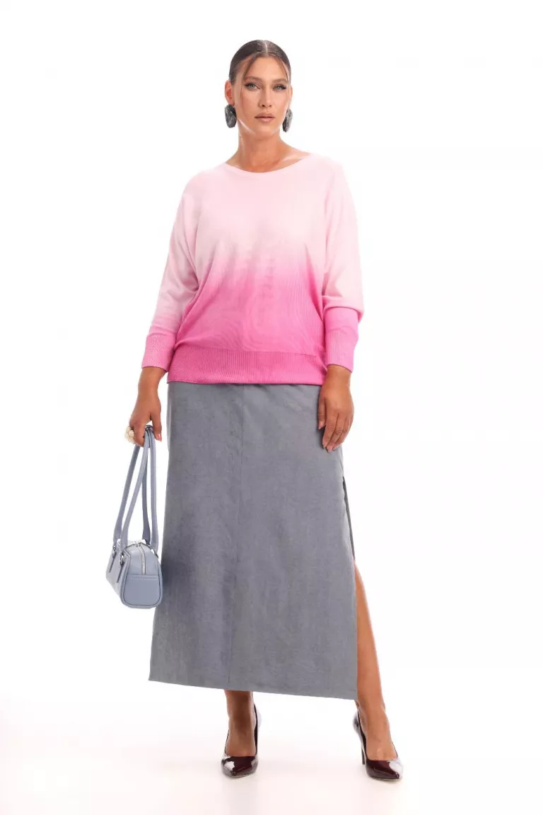 Джемпер из мягкого вискозного трикотажа — универсальная вещь для гардероба. Его длина до середины бедра, круглая горловина и длинные рукава с глубокой проймой делают модель удобной и стильной. Особенность этого джемпера — эффект деграде, то есть плавный переход оттенков, который придаёт изделию роскошный вид и добавляет интересный акцент в любой образ.