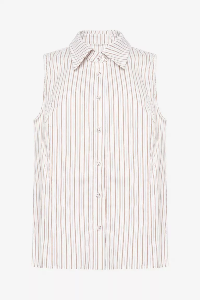 Рубашка полуприталенного силуэта, из смесового хлопка, длина миди. Воротник стояче-отложной. Спереди застежка пуговицы. Без рукавов, пройма широкая. Рубашка с принтом.