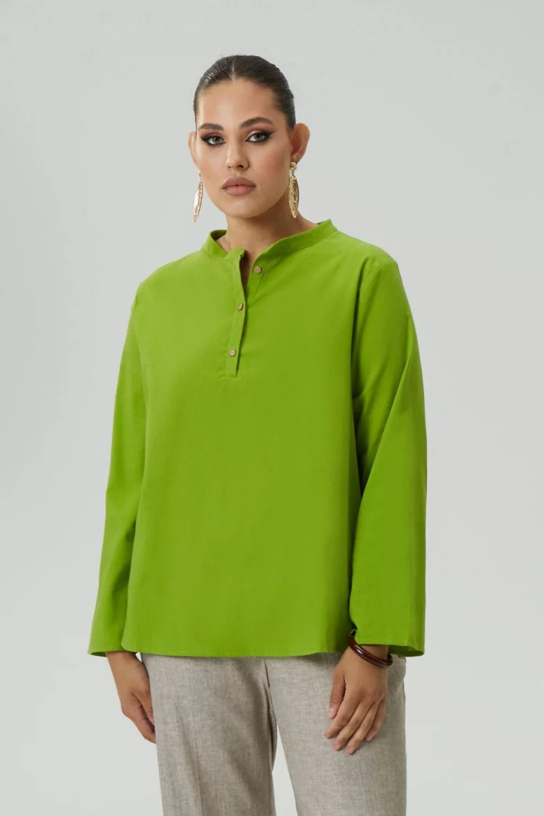 Свободная однотонная рубашка необходима для создания летних образов. В рубашке из 100% льна будет комфортно и удобно, даже на улице жарко. Яркий салатовый оттенок позволит расставить акценты в образе и создать капсулы в сочетании с синими, кремовыми, оранжевыми, розовыми и другими оттенками.