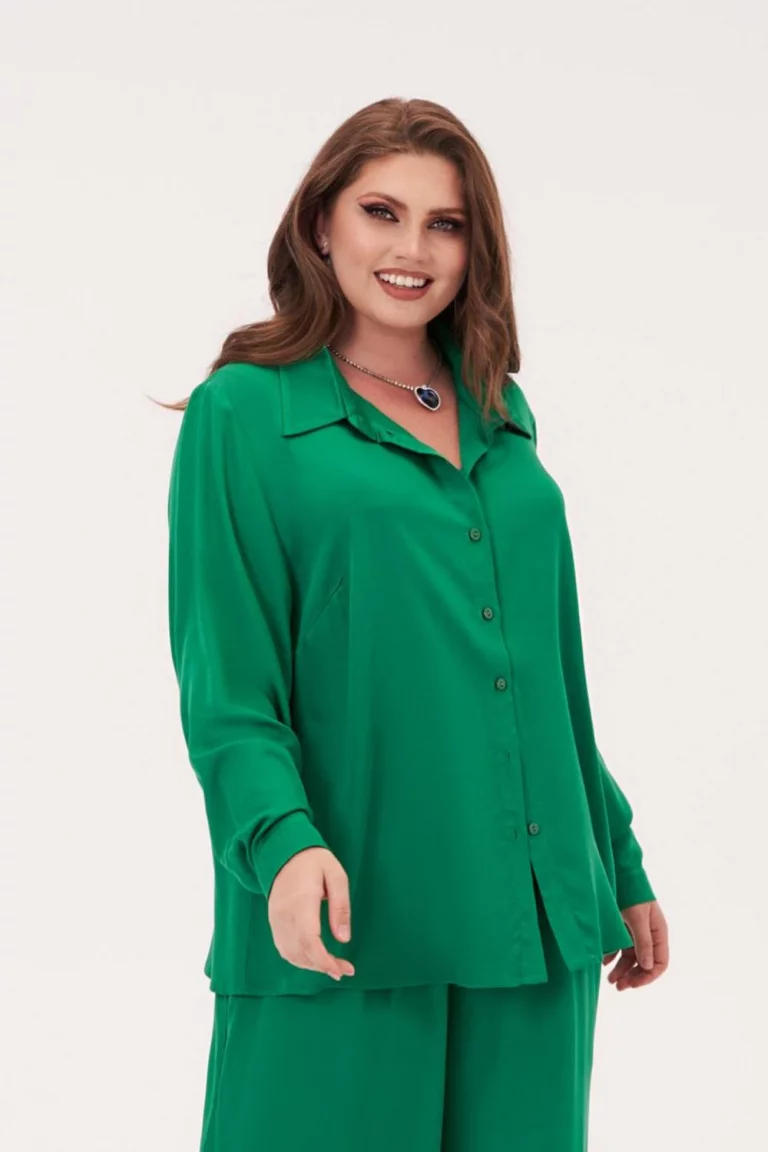 Рубашка свободного силуэта, из вискозы, длина мидия. Воротник стояче-отложной. Спереди застежка пуговицы. Рукав длинный, на отрезной манжете, пройма широкая. Крой relaxed fit отличается достаточным удобством и практичностью. Подобный крой отлично подойдет тем людям, которые хотят иметь определенную свободу при ношении одежды, которая не сковывает движения человека.
