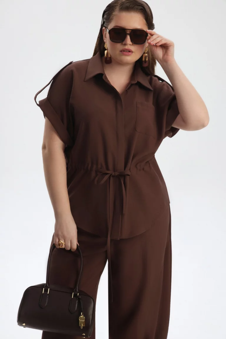 Рубашка из лиоцелла, с добавлением шелка, цельнокроеная, в стиле сафари. Длина до бедра. Воротник отложной, спереди застежка пуговицы, накладной карман. Рукав длинный, с подворотом на патах, пройма широкая. По талии кулиска.