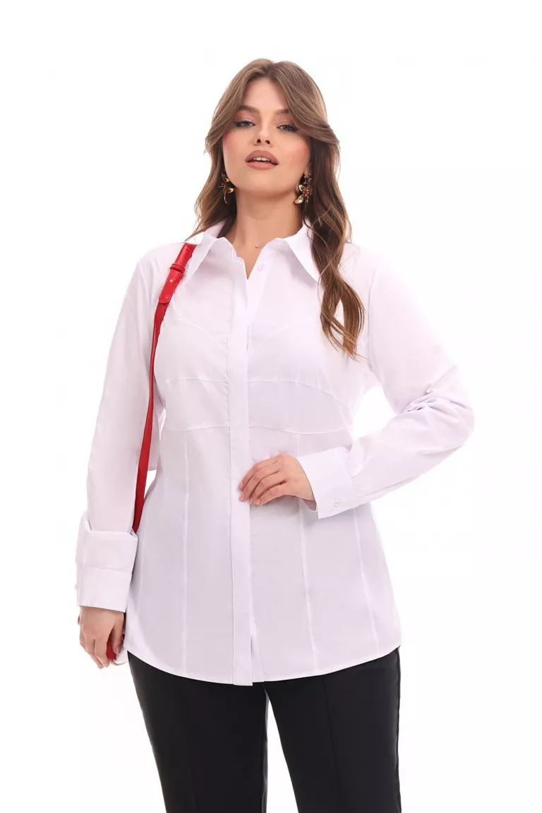 Рубашка из смесового хлопка, длина миди. Спереди корсетная строчка. Воротник стояче-отложной. Спереди потайная застежка пуговицы. Рукав длинный, на отрезной манжете, пройма широкая. На спинке шнуровка.