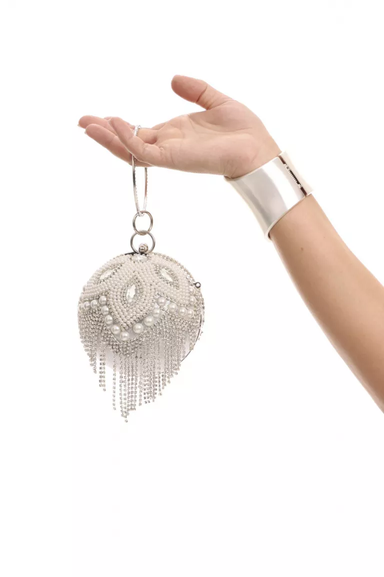 Описание: Сумка клатч с блестками и жемчугом, на замке и каркасе в виде шара. Внутри одно отделение, подкладка из ткани. Ручка металлическая, есть дополнительный ремень. Держит форму в наполненном состоянии.