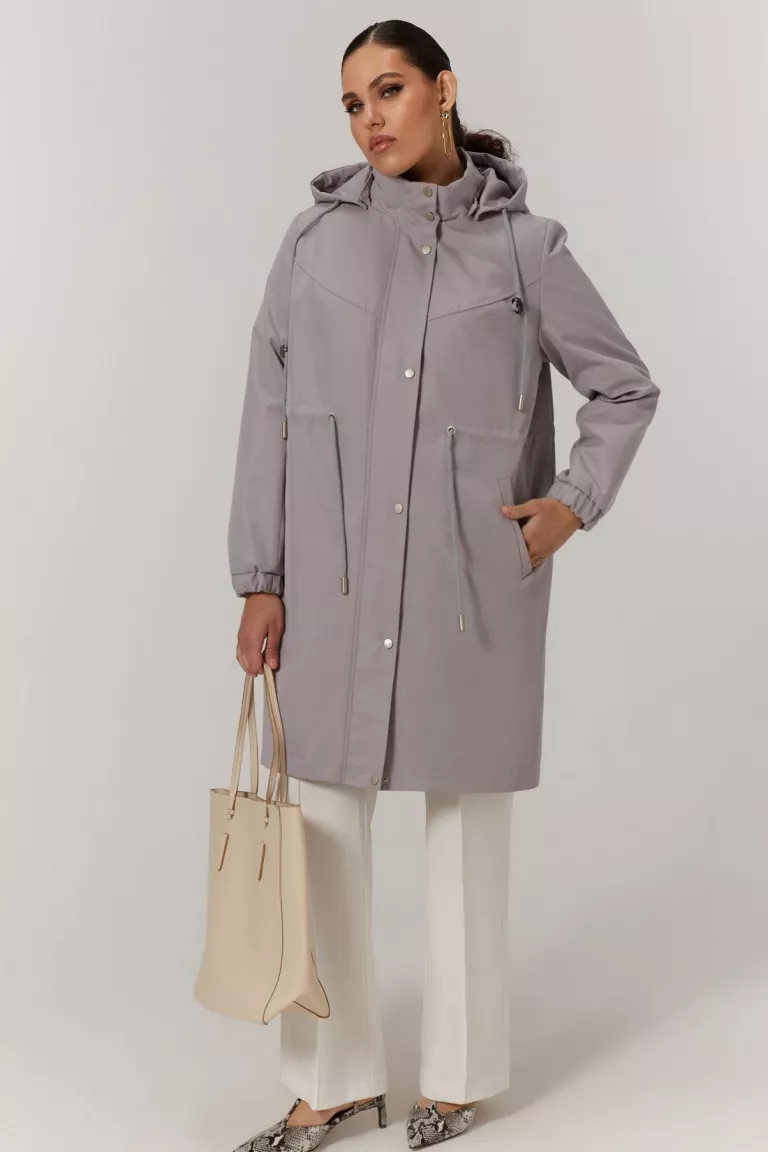 Тренч из смесового хлопка на подкладке. Тренч однобортный, с воротником стойка. Рукав длинный, на манжете. Спереди карманы c отрезным бочком. По талии внутренняя кулиска со стопарами. Капюшон отстегивающийся.