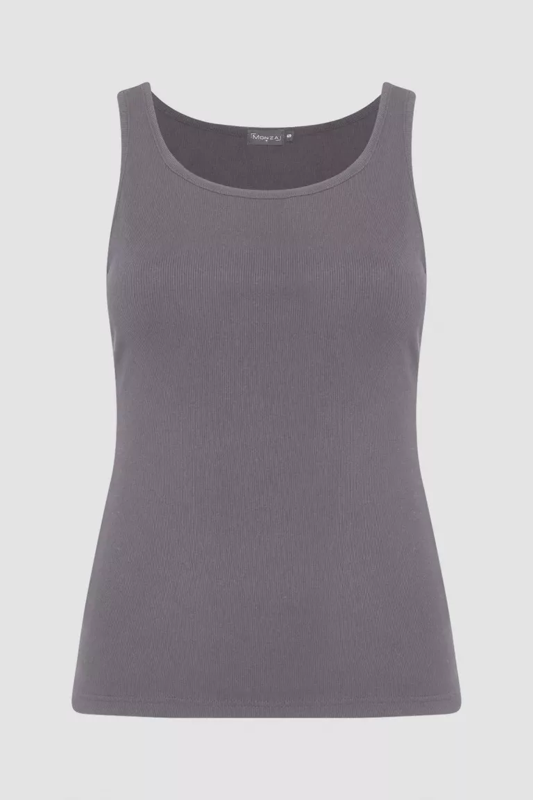 Топ свободного кроя, в рубчик, из смесового хлопкового трикотажа с хорошей эластичностью. Длина до середины бедра. Горловина округлая. Пройма широкая.