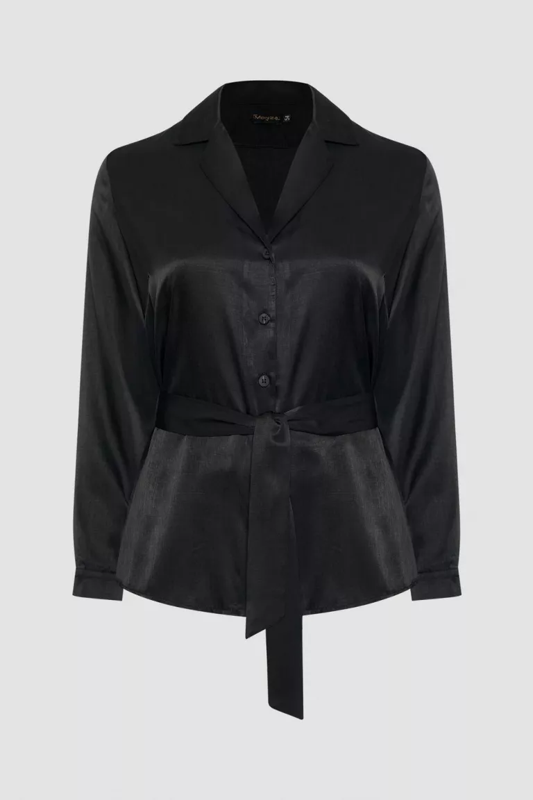 Рубашка из вискозы с фактурой шелка, длина миди. Воротник английский. Спереди застежка пуговицы и вытачки. Рукав длинный, на отрезной манжете, пройма широкая. Комплектуется поясом.