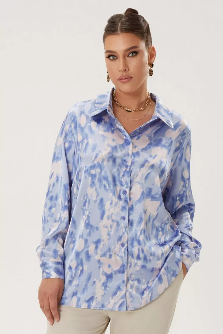 Рубашка свободного силуэта, из вискозы шелковистой фактуры, длина мидия. Воротник стояче-отложной. Спереди застежка пуговицы. Рукав длинный, на отрезной манжете, пройма широкая.