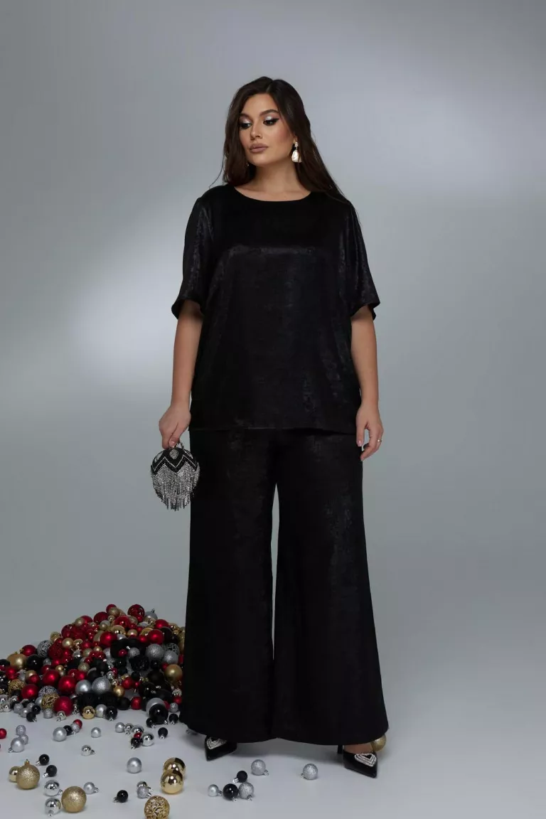 Палаццо прекрасно сочетается с тишотом из шёлка. Дополнить образ можно стильными аксессуарами, например, крупными серьгами. Для создания вечернего образа подойдут туфли на высоком каблуке и элегантное колье.