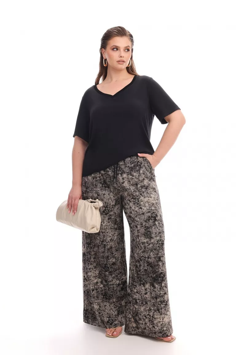 Широкие брюки из трикотажного меланжа, regular fit, длина полная. Пояс на резинке со шнурком. Посадка высокая. Regular fit — это универсальность, благодаря чему вещь в большинстве случаев не висит на теле как мешок, при этом и не прилегает.