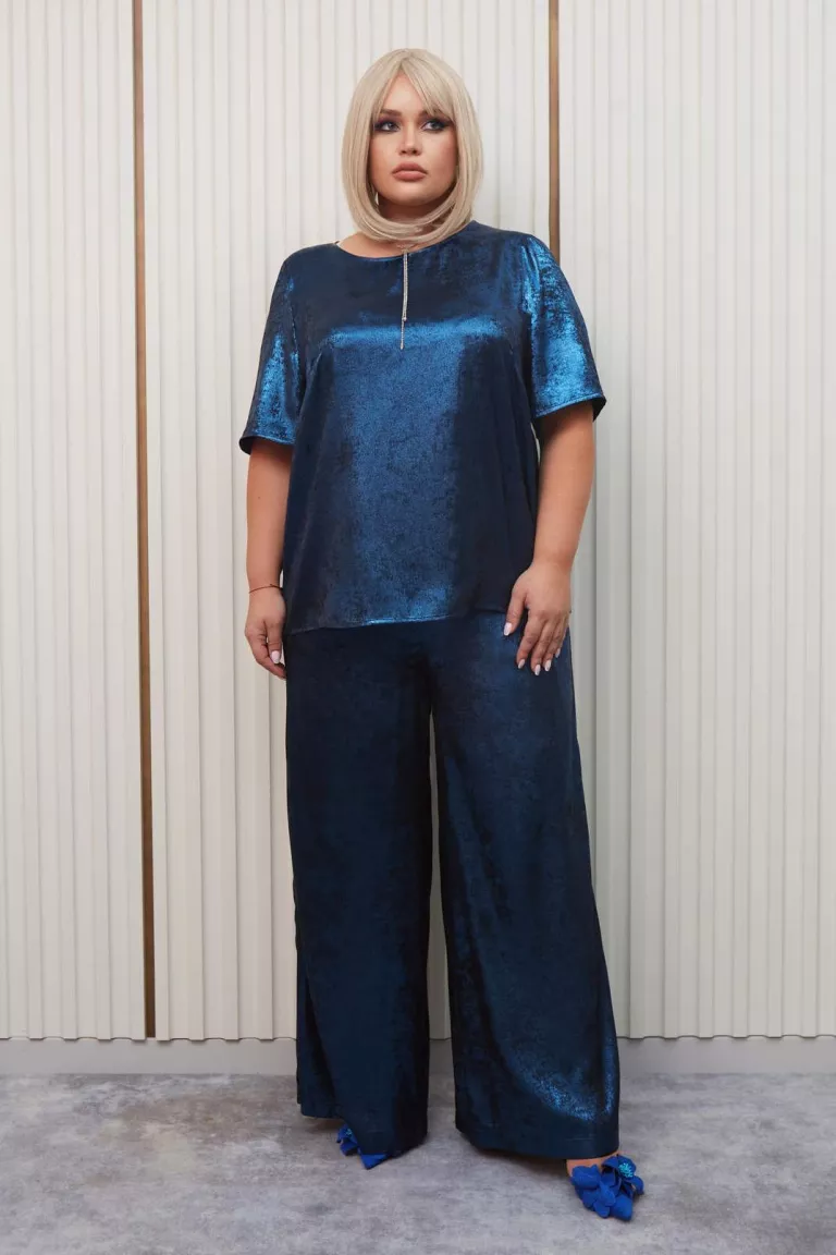 Синие шелковые брюки палаццо с фольгированным эффектом — яркий и стильный элемент гардероба. Они хорошо сочетаются с однотонными базовыми топами или элегантными блузами. Для завершения образа подойдут туфли-лодочки или босоножки на каблуке. В качестве аксессуаров можно использовать золотые украшения или сумку в тон к брюкам.