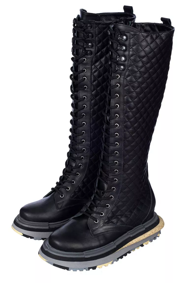 Сапоги Гела на утеплителе и сплошной подошве, с молнией и на шнуровке. Мыс круглый. Стелька из мягкого текстиля. По бокам стеганые вставки.