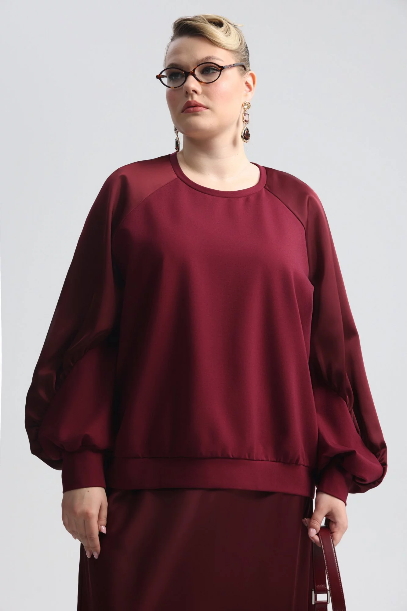 Свитшот повседневно-спортивного стиля, из поливискозного трикотажа. Длина до середины бедра. Вырез треугольный. Рукав длинный, реглан, комбинированный, с шелковой декоративной вставкой, на присборенной акцентной манжете , пройма широкая.