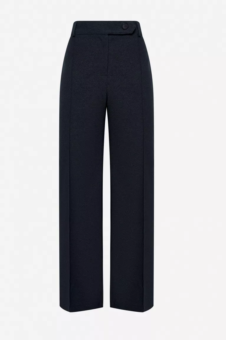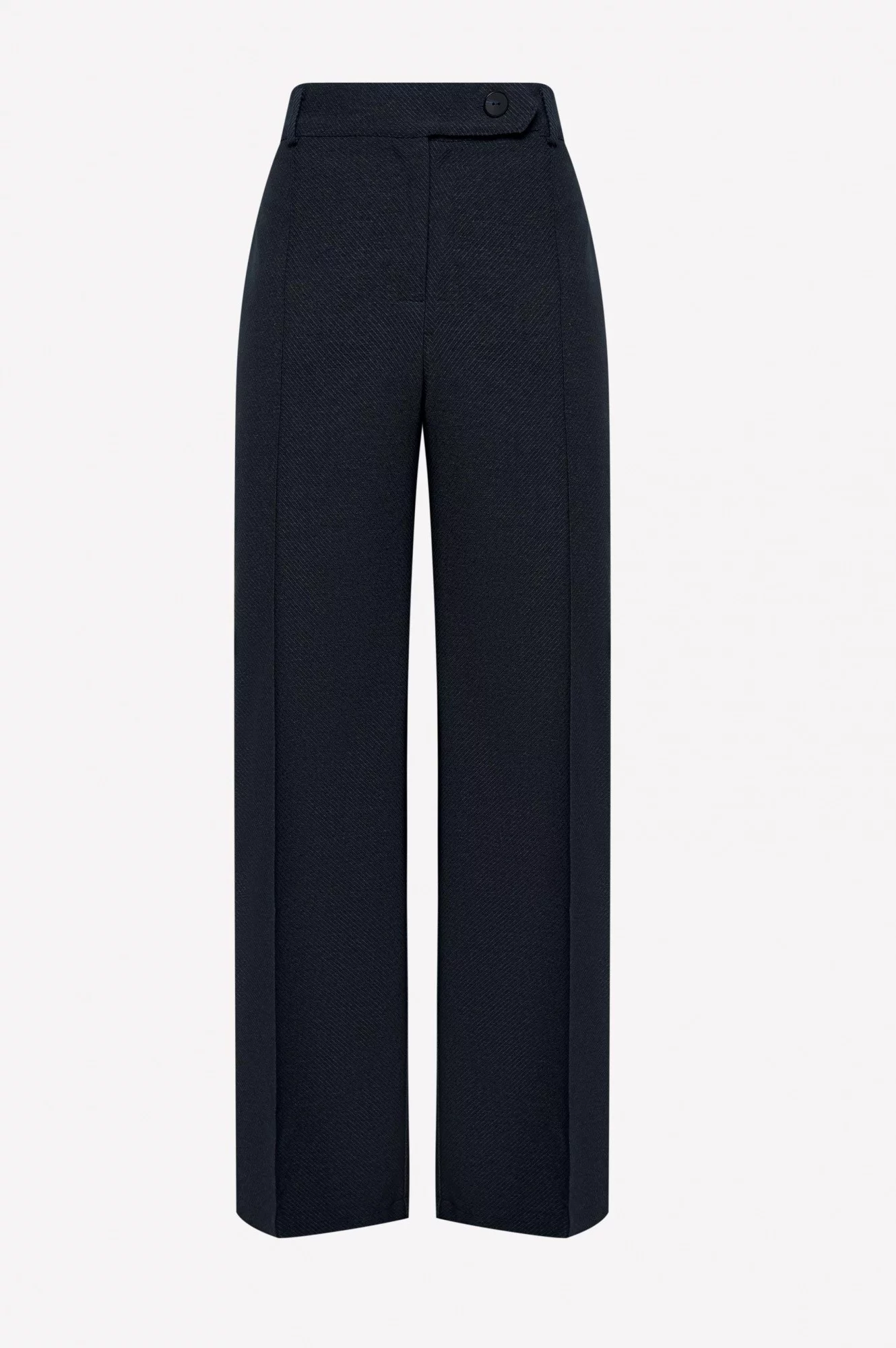 Брюки классические, прямого силуэта, базового гардероба, из смесовой вискозы, обычной длины. Пояс сзади на резинке, посадка высокая. Застежка молния. Простроченные спереди стрелки