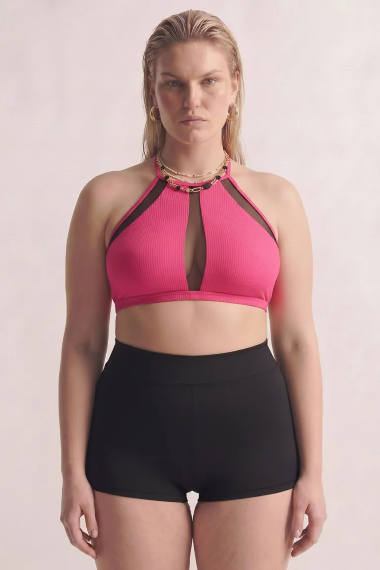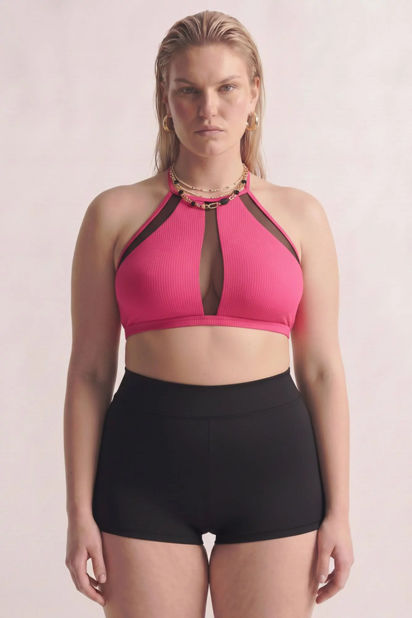 Топ бра халтер из ткани в рубчик со вставками сетка