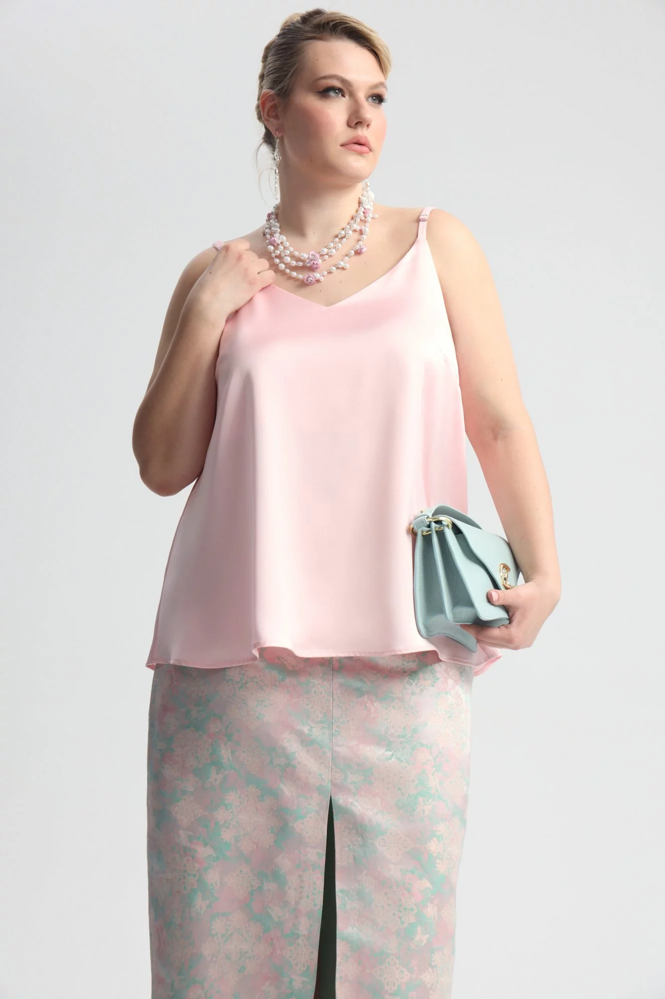 Топ А-силуэта, на тонких лямках из поливискозы, в бельевом стиле. Длина до середины бедра. Горловина "V"- образная. Пройма широкая. На переде вытачки для улучшения посадки на фигуру. Верх двуслойный.
