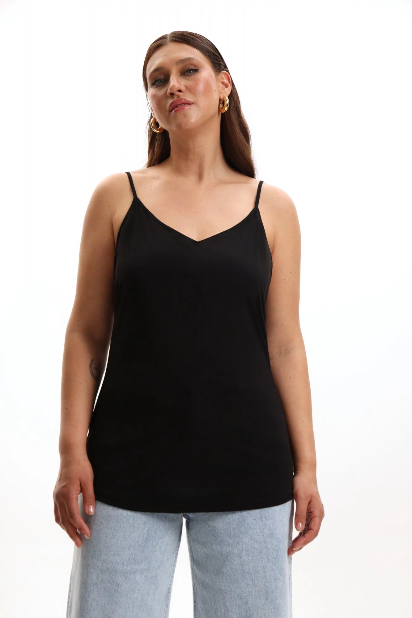 Топ свободного кроя, из трикотажа с хорошей эластичностью, на тонких лямках. Длина до середины бедра. Горловина округлая. Пройма широкая.