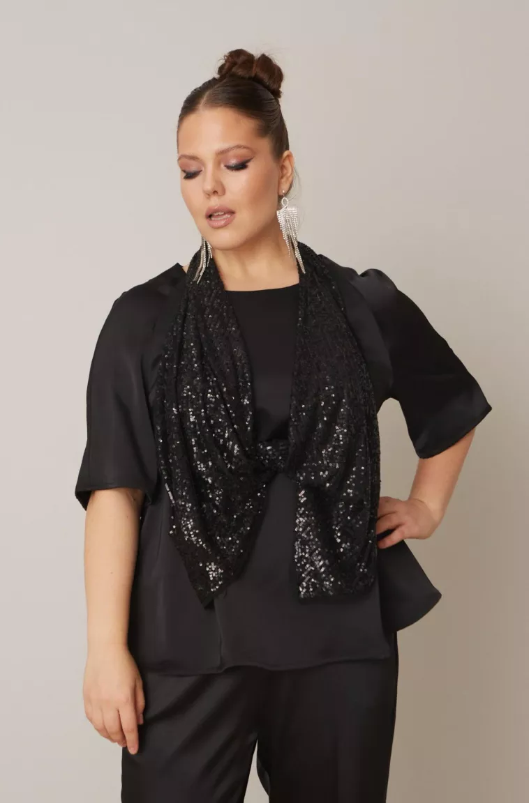 Нарядный топ с горловиной халтер, из ткани с пайетками, без подкладки. Спинка открытая на пояске. Горловина "V"- образная, лиф с имитацией запаха и завязкой.