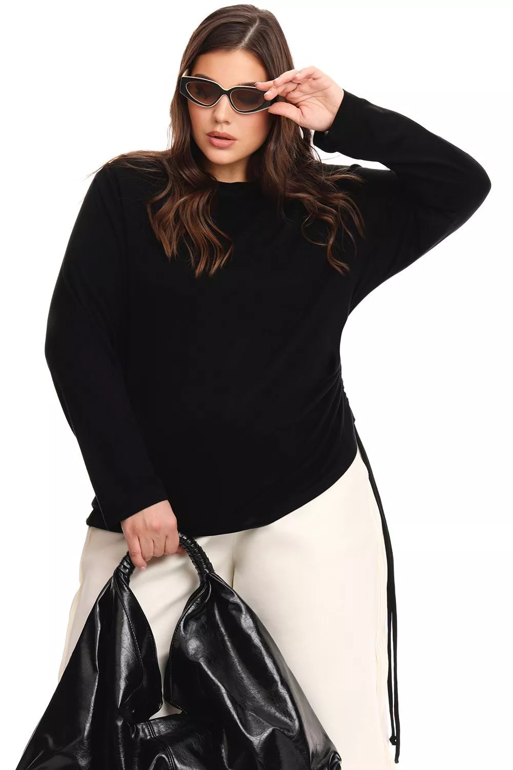 Лонгслив regular fit из поливискозного трикотажа, главная особенность которого универсальность, благодаря чему вещь в большинстве случаев не висит на теле как мешок, при этом сильно не прилегает. Длина до середины бедра, горловина с вырезом лодочка и боковой драпировкой с кулиской. На плече защипы. Рукав длинный, пройма широкая.