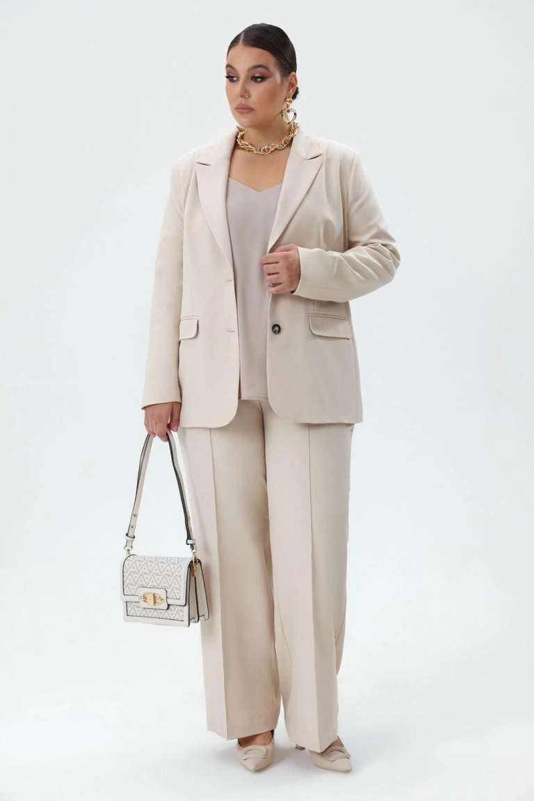 Однобортный жакет полуприлегающего силуэта, на подкладке и пуговицах из костюмной ткани. Длина миди. Воротник английский, с лацканами. На спинке рельефы, центральный шов и 2 шлицы. Спереди вертикальные вытачки и внутренние карманы. Рукав длинный, с выраженной линией плеча, пройма углубленная. В качестве застежки пуговицы.