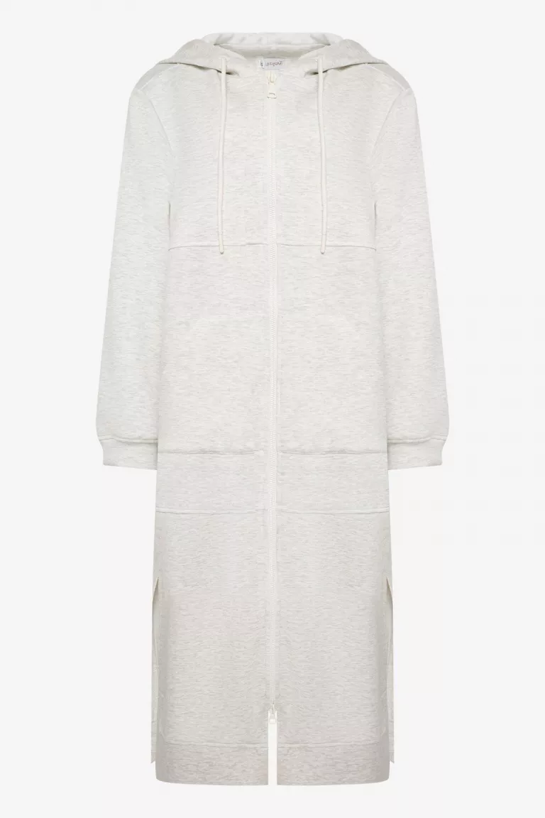 Удлиненная парка-платье из смесового меланжевого трикотажа, повседневно-спортивного стиля, на молнии, без подкладки. Длина миди, капюшон. Рукав длинный, на манжете, пройма широкая. Карманы кенгуру. По бокам разрезы. На спинке отрезная кокетка.