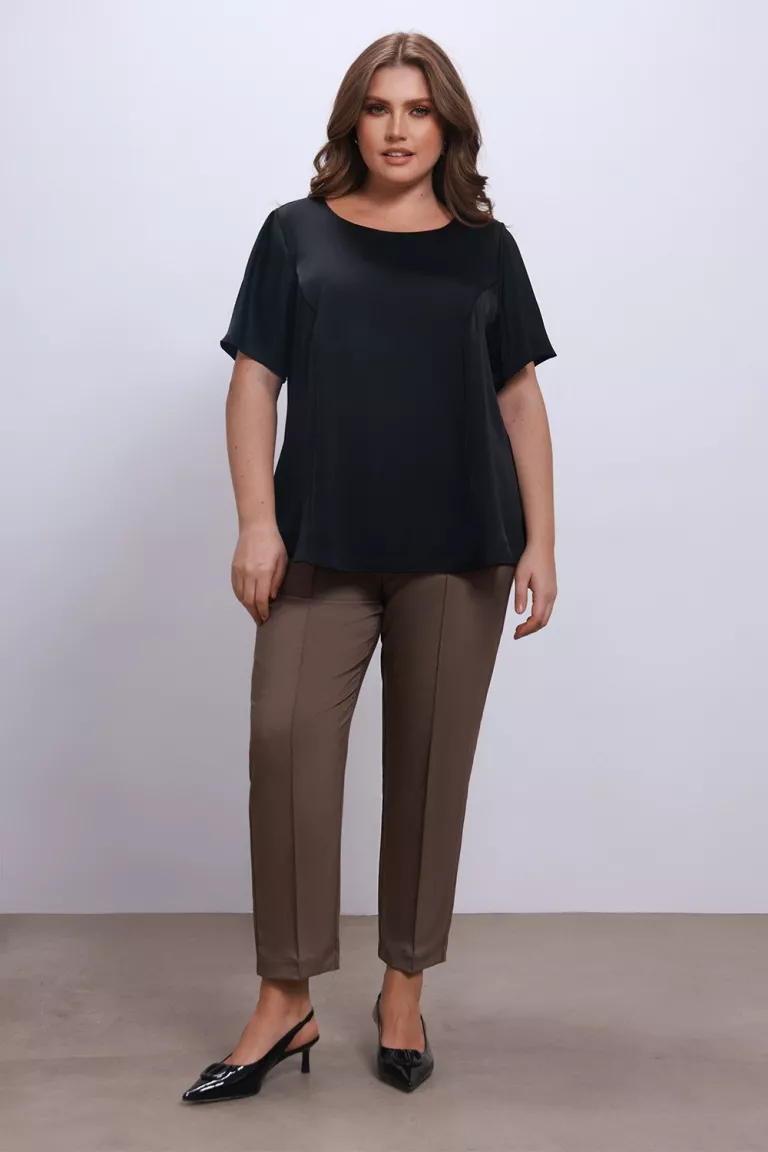 Брюки-дудочки из смесовой вискозы — это стильный и комфортный выбор для делового образа. Брюки слегка укороченные с высокой посадкой, пояс на резинке сзади, что делает их удобными на протяжении всего дня. По бокам расположены карманы с отрезным бочком, а простроченные стрелки спереди и сзади придают строгий и элегантный вид. Фасон "дудочки" означает, что брюки сужаются к низу и приоткрывают щиколотки, что добавляет образу лёгкости и изысканности.