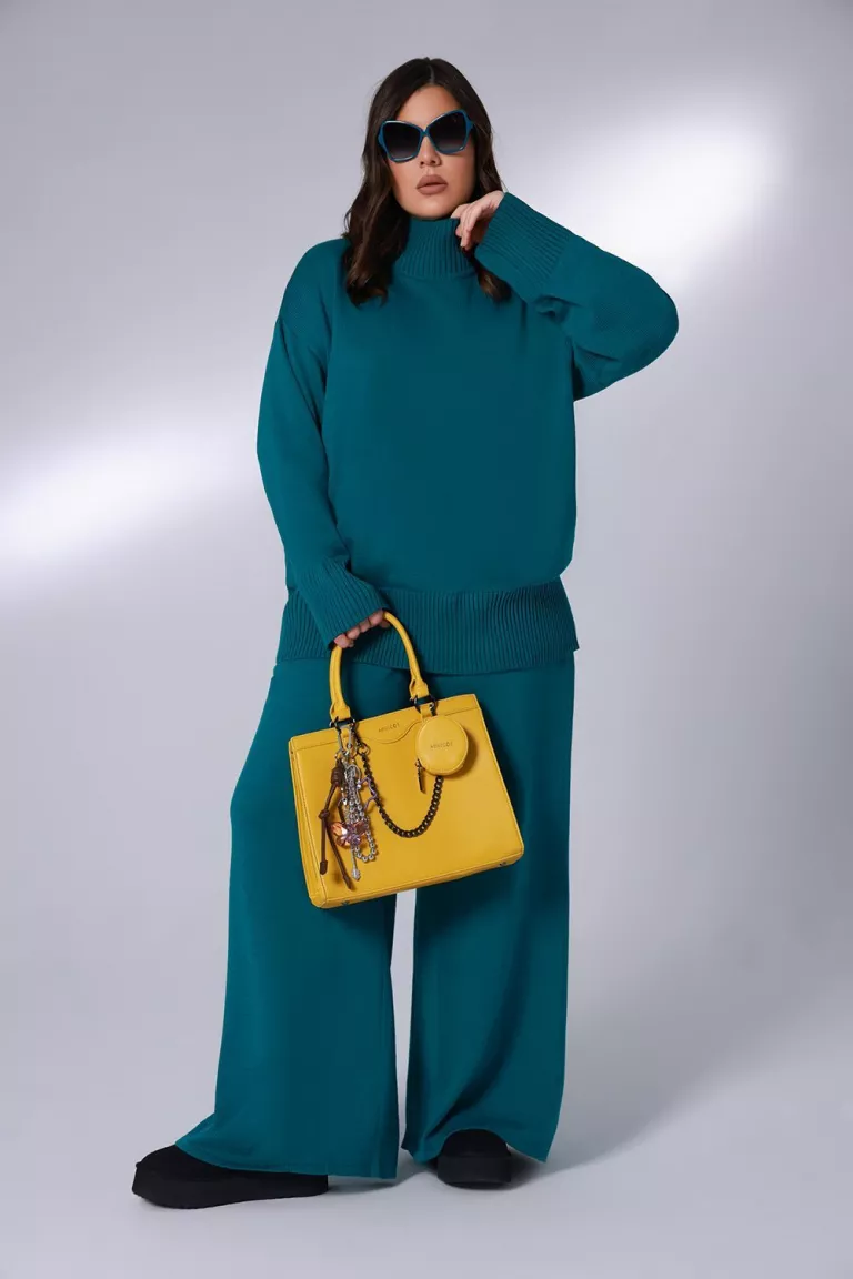 Палаццо из смесового вязаного хлопкового трикотажа, длина полноразмерная. Пояс на широкой резинке. Основное отличие данного типа фасона, — это универсальность, благодаря чему вещь в большинстве случаев не висит на теле как мешок, при этом и не прилегает. Посадка high-wasted rise-высокая. Такой тип посадки способен лишний раз подчеркнуть красоту тела, не выделяя при этом явных недостатков. Брюки создают эффект бесконечно длинных ног.