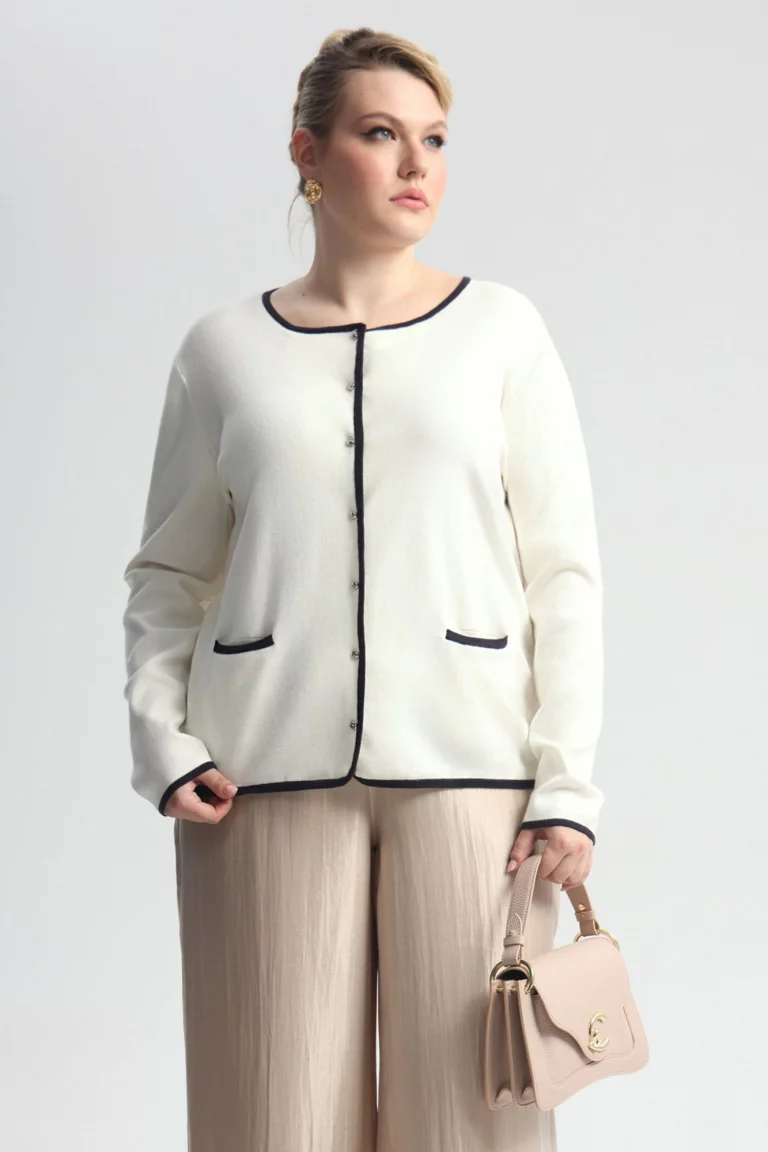 Однобортный жакет из вязаного смесового трикотажа. Длина до бедра. Воротника нет. Спереди накладные карманы. Рукав длинный, пройма углубленная. В качестве застежки пуговицы. Контрастная отделка изделия.