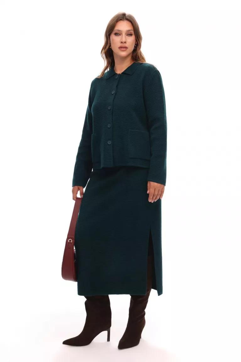 Этот костюм из смесовой шерсти состоит из юбки и жакета, которые идеально дополняют друг друга. Жакет свободного кроя выполнен без подкладки, застёгивается на пуговицы и имеет классический отложной воротник. Его длина — миди, что делает модель универсальной. Длинные рукава с углублённой проймой и удобные накладные карманы добавляют практичности.