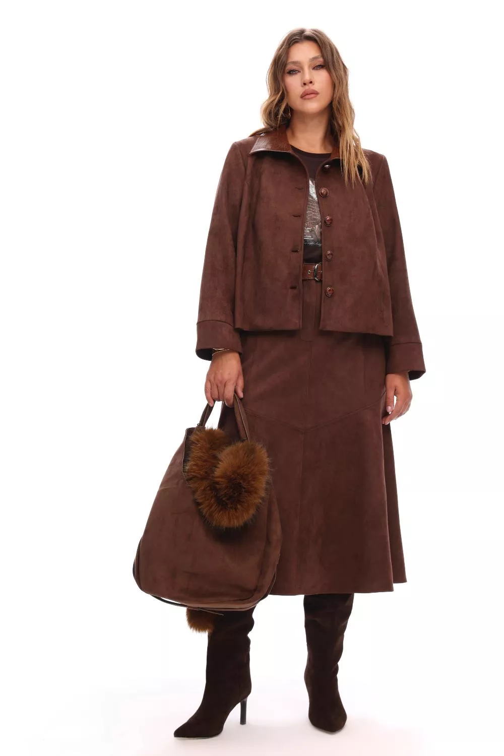 Юбка-годе из экозамши, с хорошей эластичностью, без подкладки. Длина миди. Пояс втачной-резинка сзади. Застежка молния спереди. Комплектуется ремнем из экокожи.