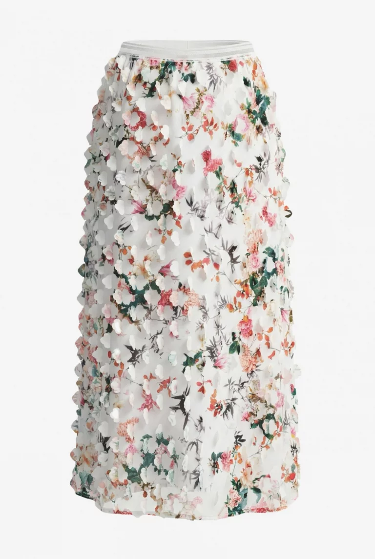 Юбка комбинация (слип) трапециевидного силуэта из шифоновой ткани, на подкладке из смесовой вискозы, с принтом и 3D эффектом. Длина миди. Пояс втачной-резинка.