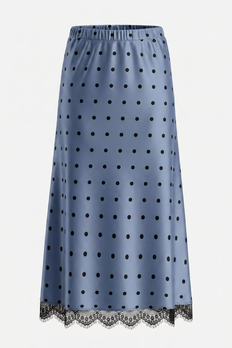 Юбка комбинация (слип) трапециевидного силуэта из поливискозы с принтом горох, на подкладке из поливискозы. Длина миди. По низу отделка кружевом. Пояс втачной-резинка.