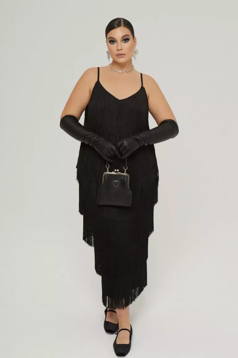 Чёрная юбка на подкладке с бахромой прекрасно сочетается с топом из комплекта. Для завершения эффектного образа рекомендуется добавить обувь в классическом стиле, сумочку и украшения.