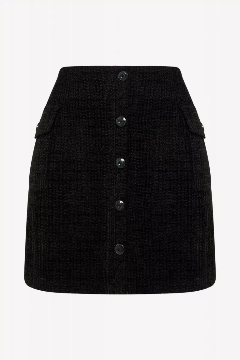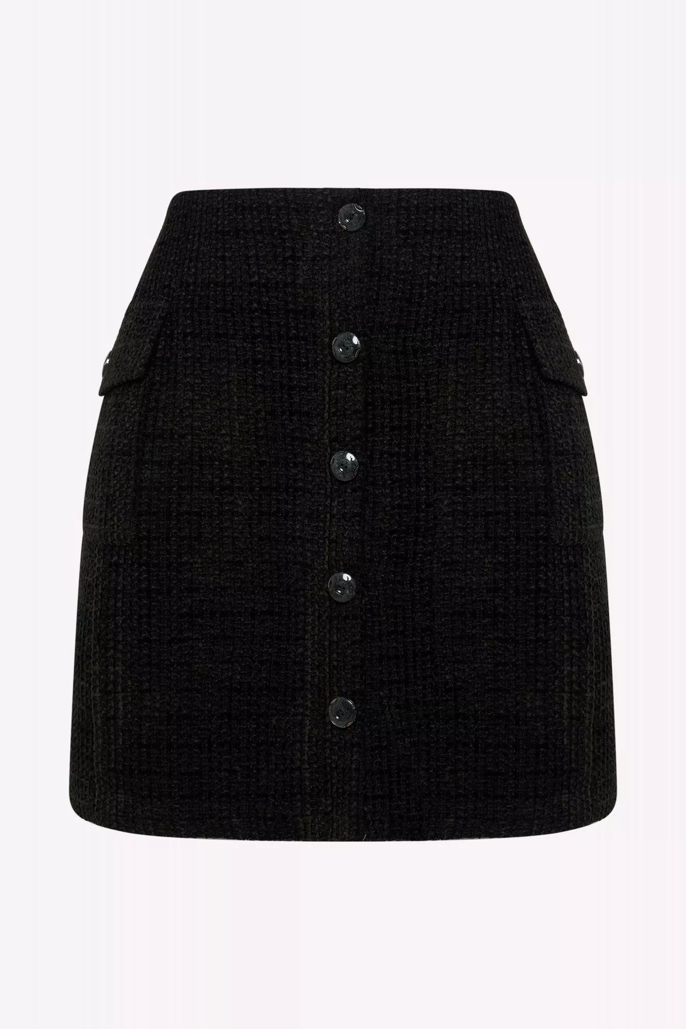 Мини юбка а-силуэта, из облегченного твида, на подкладке. Длина мини. Юбка шестиклинка. Застежка спереди на верхние пуговицы, снизу имитация застежки. Есть накладные карманы.