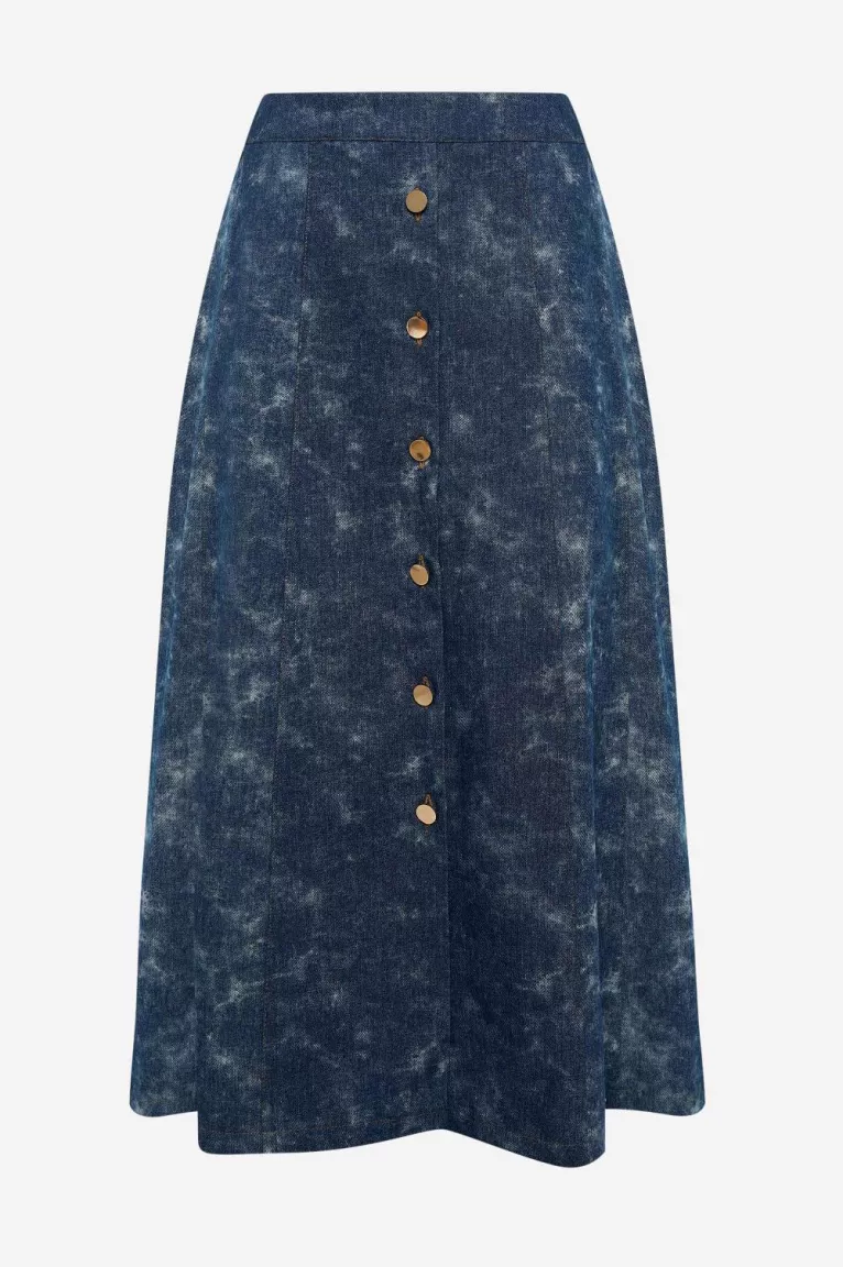 Юбка а-силуэта из джинсовой ткани с вареном эффектом стоун вош, с клиньями и хорошей эластичностью, без подкладки. Длина миди. Пояс втачной-резинка. Спереди имитация застежки пуговицы.
