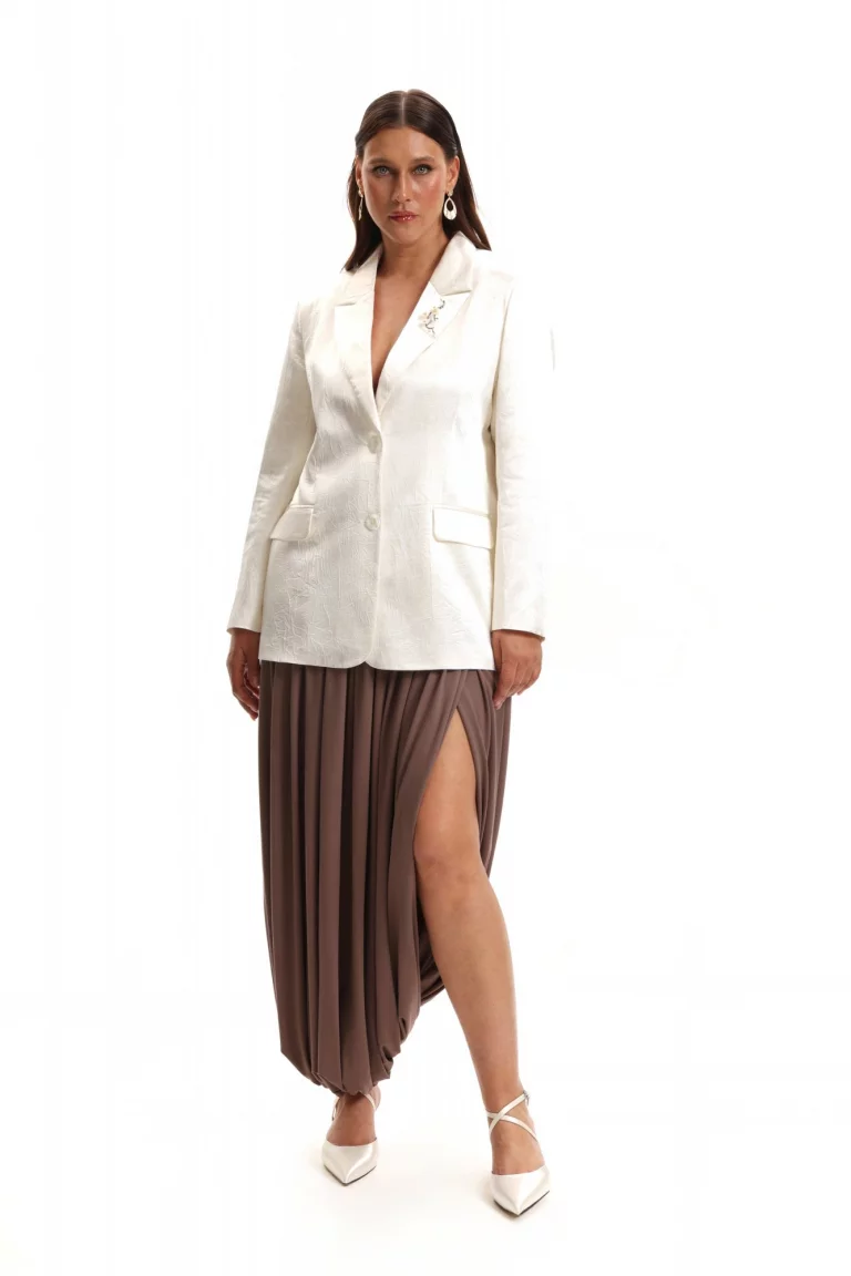 Ее называют и юбка алладины и баллон, и тюльпан с перекрутом, но суть одна: это длинная, струящаяся юбка с эффектным объемным перекрутом подола.