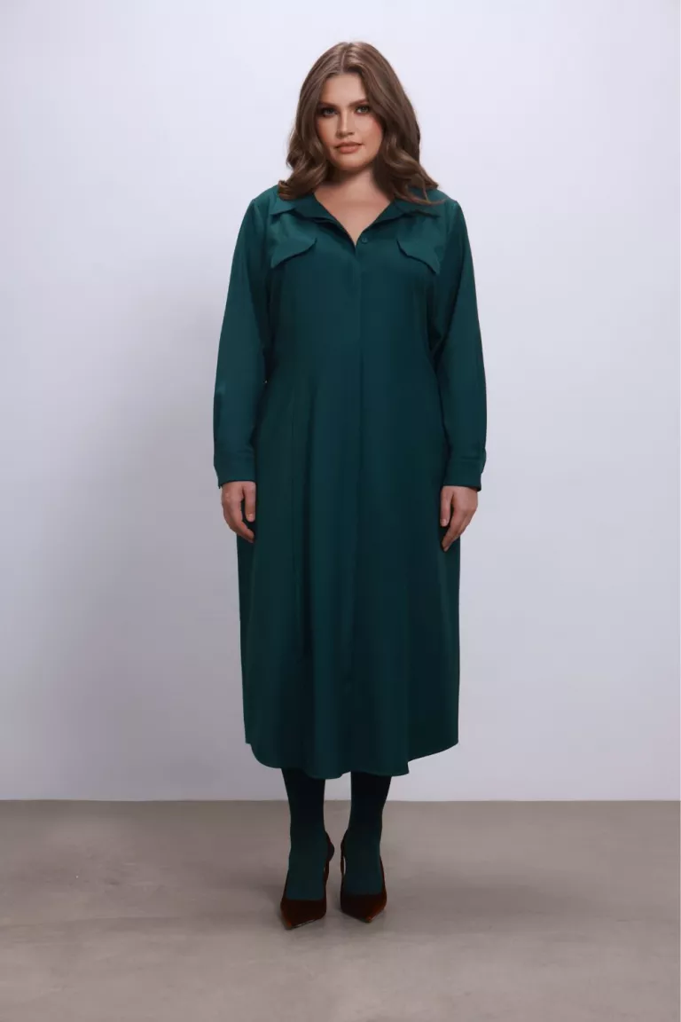 Платье-рубашка прямого силуэта, выполненное из смесовой вискозы, идеально сочетает стиль и комфорт. Длина миди делает его универсальным вариантом как для повседневного, так и для романтичного образа. Воротник стояче-отложного типа, а спереди предусмотрена скрытая застёжка на пуговицах, что добавляет аккуратности дизайну. Верхняя часть платья дополнена рельефными швами и имитацией карманов. Длинные рукава с манжетами и широкими проймами обеспечивают свободу движения. В боковых швах расположены удобные карманы, а комплектный пояс позволяет подчеркнуть талию.