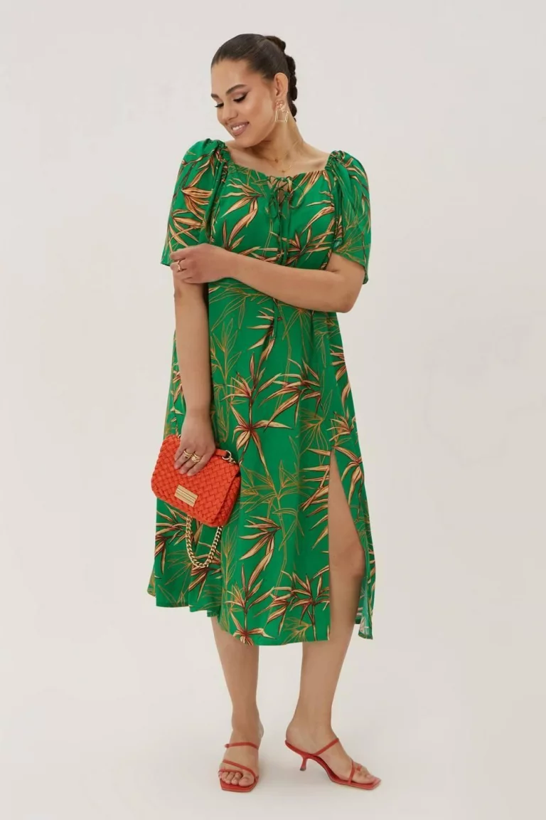 Платье из вискозы приталенного силуэта, длина миди. Вырез фигурный, на шнуровке. Рукава реглан. крылышки, на резинке в районе плеча, пройма широкая. Спереди разрез.