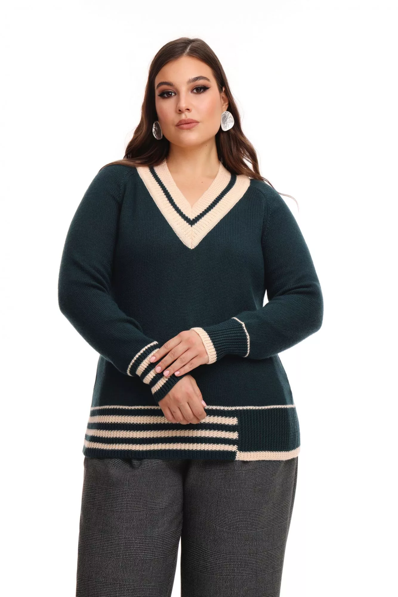 Этот джемпер в стиле преппи (университетский) создан из вязанной шерсти с добавлением кашемира. У него длинные рукава реглан и v-образный вырез, а по краям рукавов, низу и вырезу проходят стильные контрастные полоски, которые добавляют яркости и акцента.