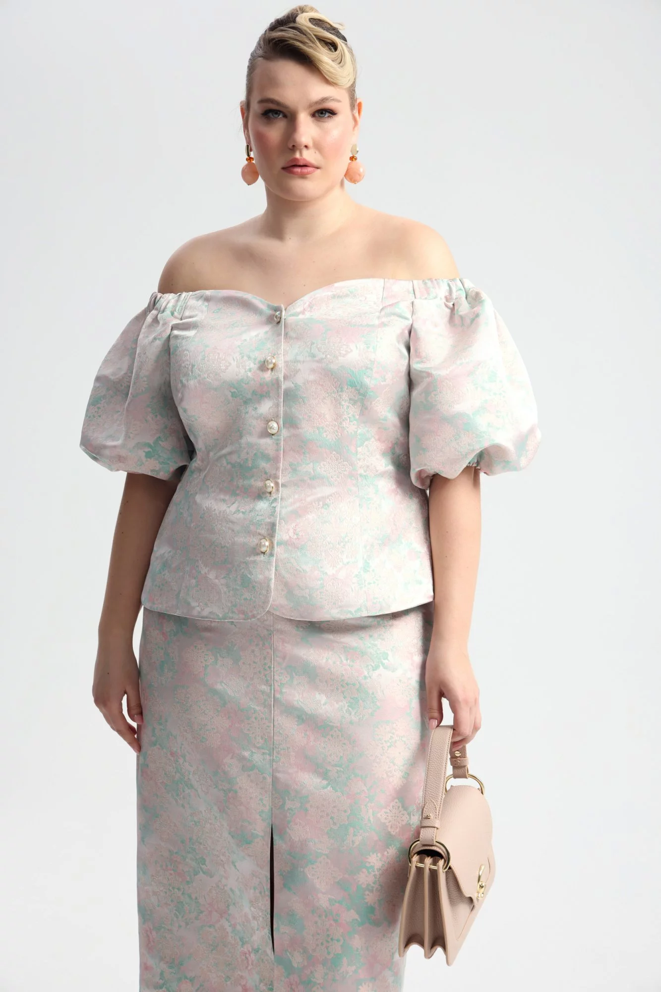 Жакет приталенного силуэтного покроя, из поливискозного жаккарда, на подкладке, длина миди. Горловина лодочка. Застежка пуговицы. Рукав реглан, фонарик, 3/4, на резинке по плечу, пройма углубленная.