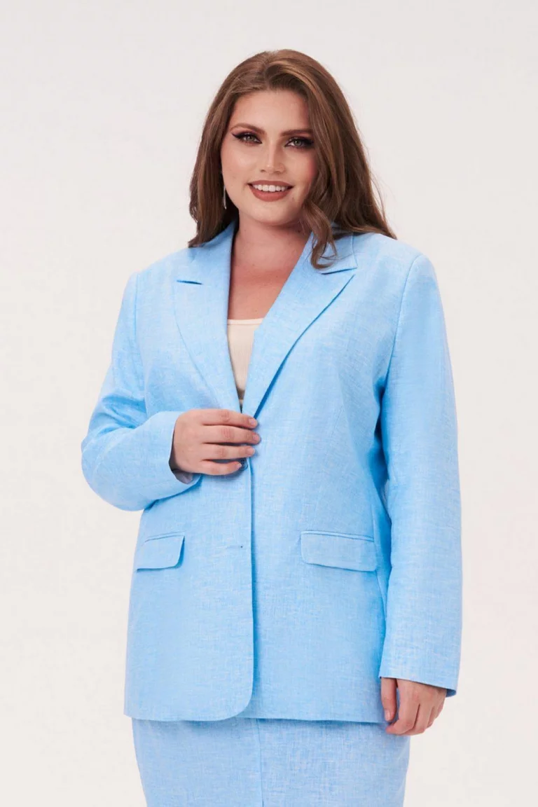 Однобортный жакет полуприлегающего силуэта изо льна, на подкладке и пуговицах. Длина миди. Воротник английский, с лацканами. На спинке рельефы, центральный шов и 2 шлицы. Спереди вертикальные вытачки и внутренние карманы. Рукав длинный, с выраженной линией плеча, пройма углубленная. В качестве застежки пуговицы.