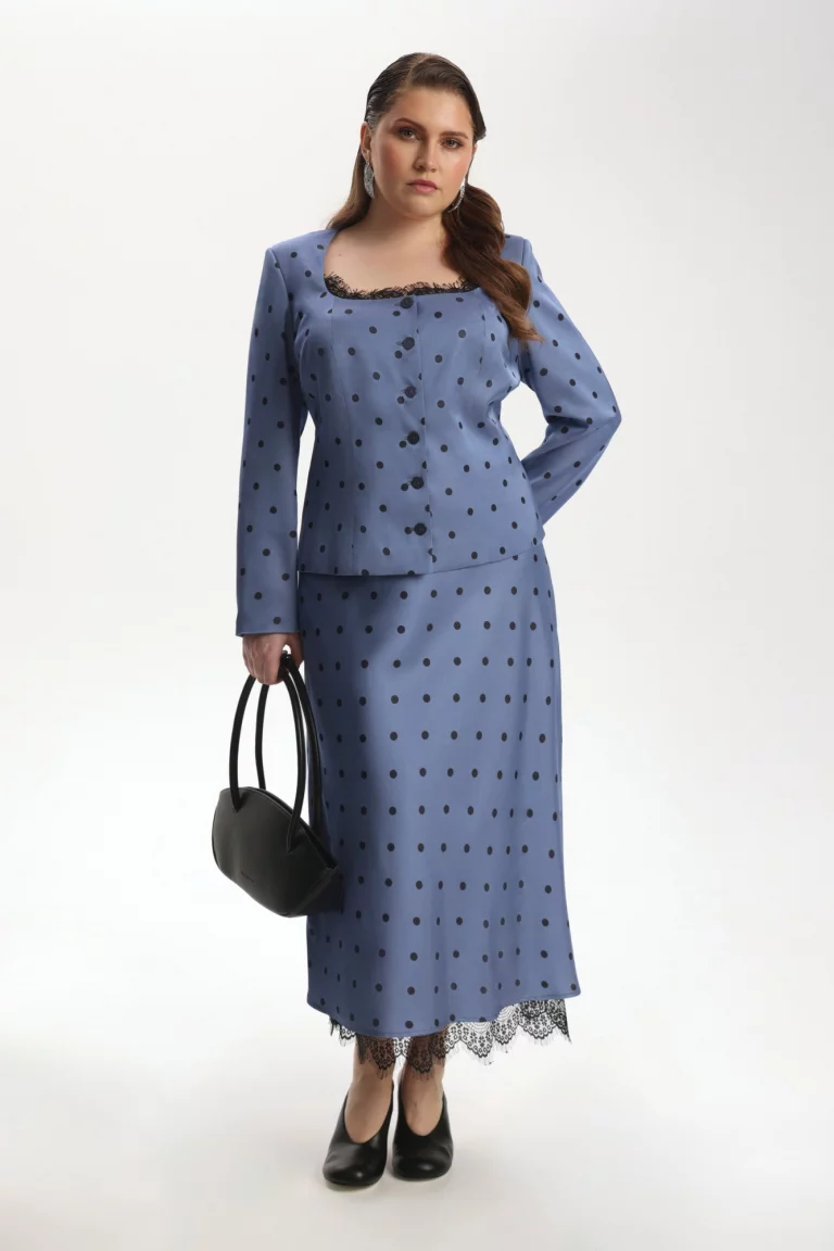 Однобортный жакет приталенного силуэта с вырезом каре и отделкой кружевом, застежки пуговицы. Жакет из поливискозного шелка с принтом. Длина до середины бедра. Воротник стойка. На спинке рельефы, центральный шов. Рукав длинный, пройма углубленная.