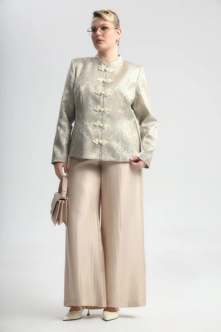 Однобортный жакет приталенного силуэта, с застежкой китайский узел (панькоу). Жакет с жаккардовым принтом. Длина до середины бедра. Воротник стойка. На спинке рельефы, центральный шов. Рукав длинный, пройма углубленная.