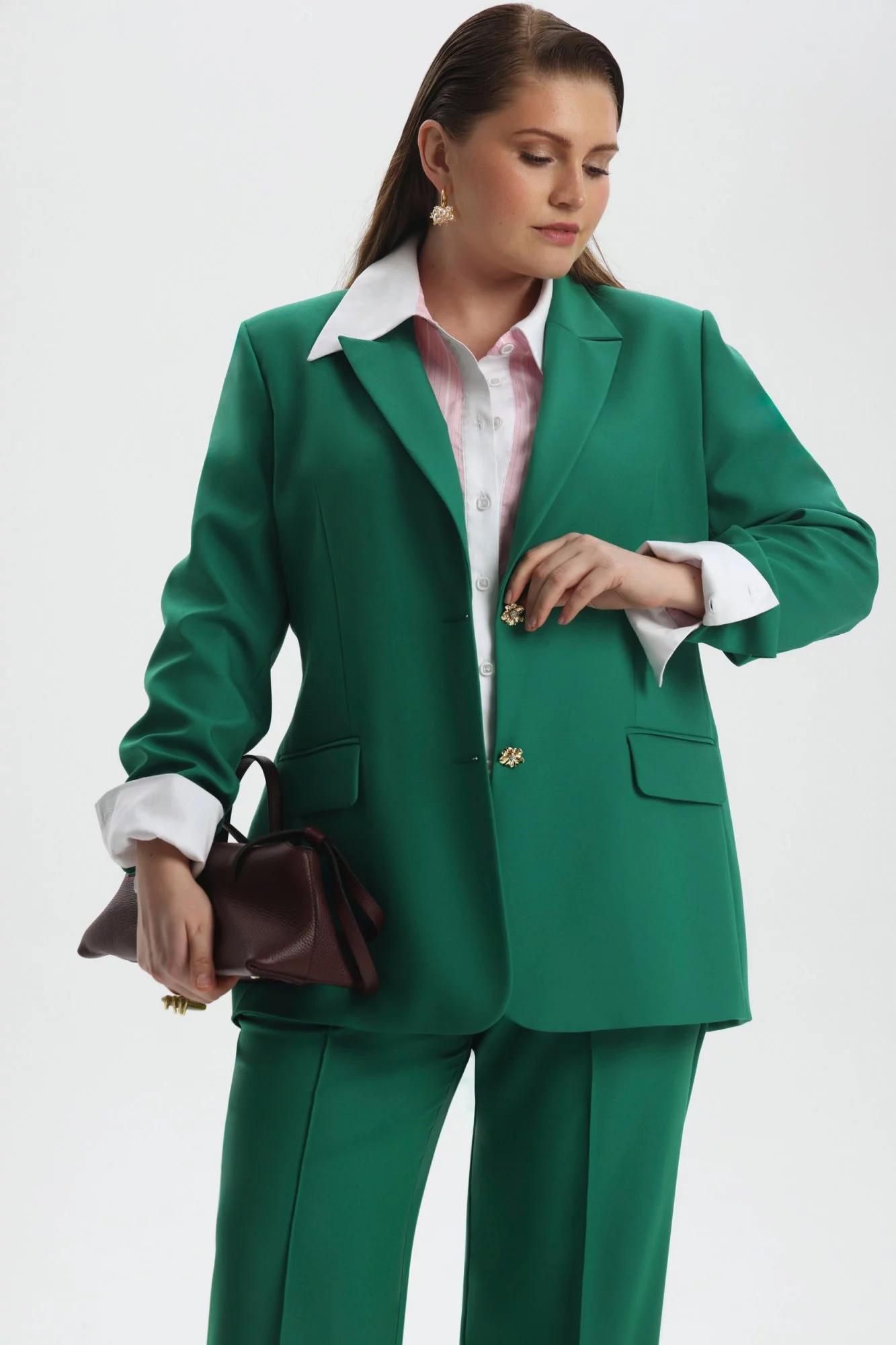 Однобортный жакет полуприлегающего силуэта, на рост 172, на подкладке и пуговицах, из легкой костюмной ткани. Длина миди. Воротник английский, с лацканами. На спинке рельефы, центральный шов и 2 шлицы. Спереди вертикальные вытачки и внутренние карманы. Рукав длинный, с выраженной линией плеча, пройма углубленная. В качестве застежки пуговицы.