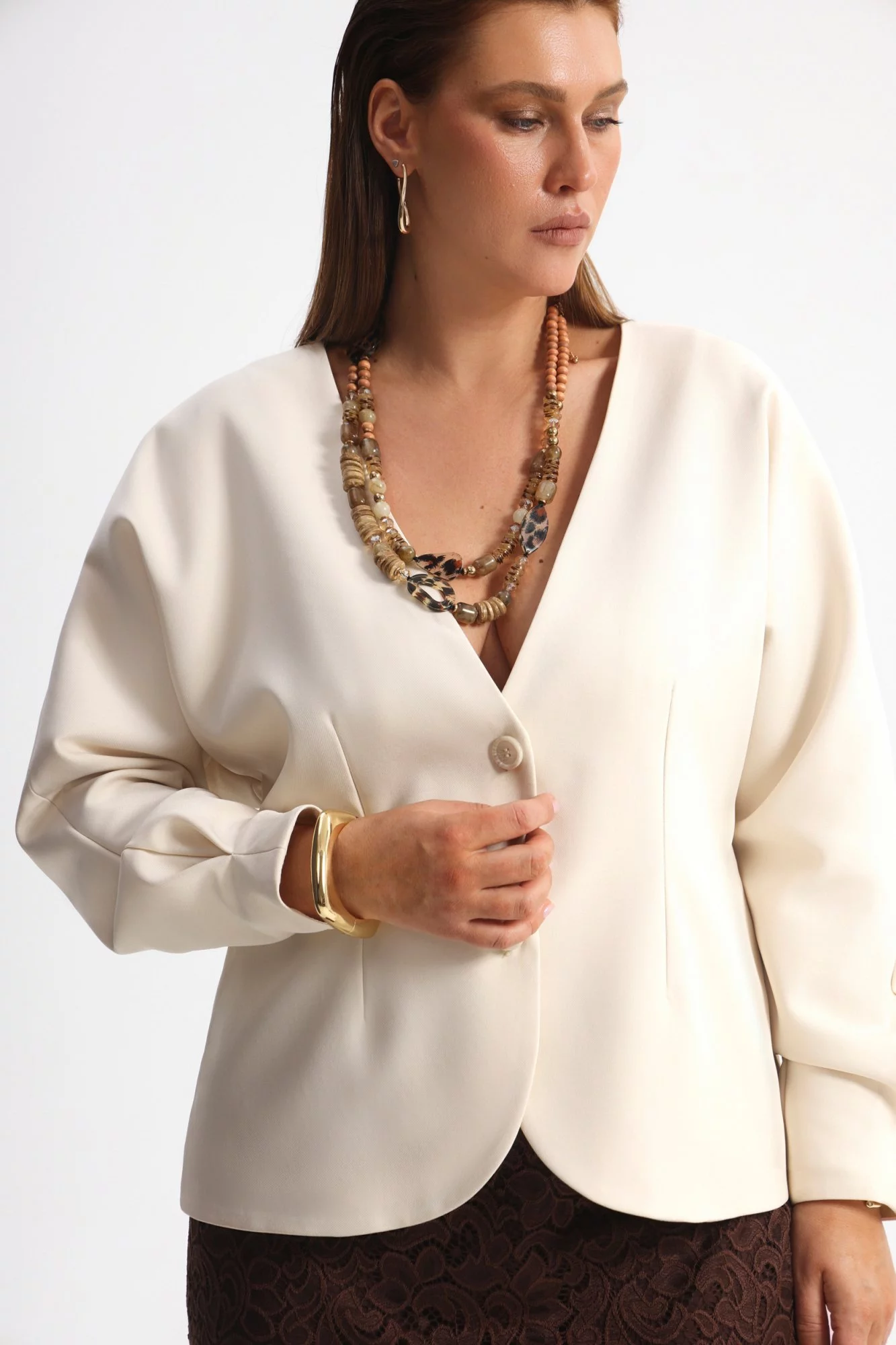 Однобортный жакет приталенного силуэта, на подкладке и пуговицах, из костюмной ткани. Длина миди. Жакет с лацканами и защипами. Рукав длинный, цельнокроеный спереди, объемный, О-силуэта, с выраженной линией плеча.